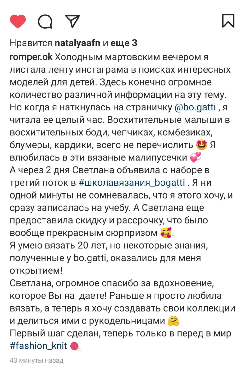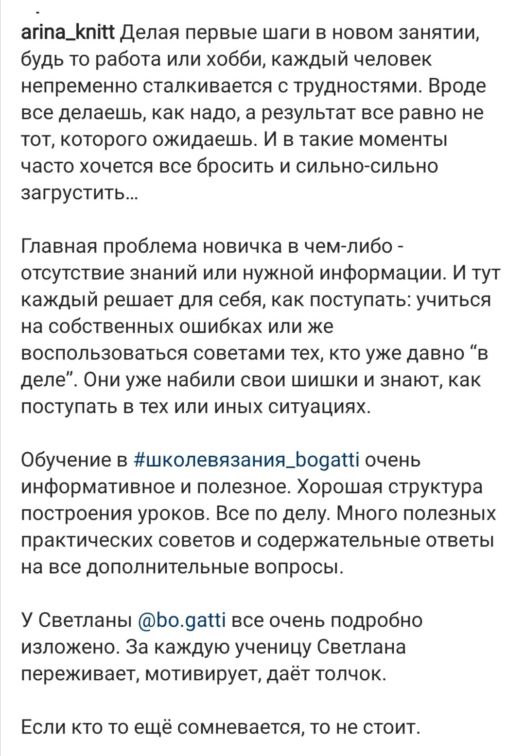 В Школе Вязания @bo.gatti начался новый этап обучения и сокурсницы пишут отзывы о первом этапе.А я не могу подобрать слов. Как можно вместить в отзыв, то что со мной произошло?Что написать о человеке, который изменил мою жизнь, подарил крылья и научил летать?Надежда сравнила обучение в школе с большим флаконом драгоценного эфирного масла. И это так.10 лет я сидела дома (в декрете с погодками, а потом по уходу за своим особенным сыночком), не работала, ничего не создавала, не могла найти себя. Я вязала игрушки в детский сад, но ничего не увлекало меня.В середине июня начался @bogatti_marafon.Я не умела вязать спицами совсем, я их ненавидела. Но марафон перевернул мое сознание. Загорелись глаза, захотелось приблизиться к волшебному миру необыкновенно красивых вещей и бесподобных фотографий.Я связала два кардигана. И поставила себе цель - довести свой визуал до уровня тестовой группы.Я не планировала вязать на заказ. Я просто хотела попасть в тестовую группу Светланы, что бы быть рядом и впитывать все ее знания!Я покупала все МК @bo.gatti, вязала и фотографировала.20 июля, в день своего сорокалетнего юбилея, я узнала, что вошла в восьмёрку лучших участниц марафона. Это был самый желанный подарок!А ещё через 10 дней Светлана пригласили меня в тест! Моя МЕЧТА исполнилась!Услышав про школу, сразу поняла, это то, что нужно мне здесь и сейчас!Мой уровень вязания сильно отличался от уровня других учениц, я приобрела Стартовый пакет только поэтому. Я сомневалась в себе, а не в школе.Было много слез. Тяжело учиться новому, просидев дома 10 лет. Но все получается.Девочки назвали Светлану учителем от Бога. Это правда!Светлана - наша Фея, наш вдохновитель, наш двигатель! Хочется как можно дольше находиться рядом, учиться, учиться и учиться!Светлана, спасибо за все! Вы не только вкладываете в нас бесценные знания и опыт, заставляете снова мечтать, заряжаете ставить цели, работать и достигать результатов.Вы удивительным образом сколотили вокруг себя банду самых душевных мастериц и подарили каждой из нас настоящих друзей и единомышленников!Каждый день я просыпаюсь с удовольствием, радуюсь, вдохновляюсь, наслаждаюсь.Я даже снова пишу стихи.