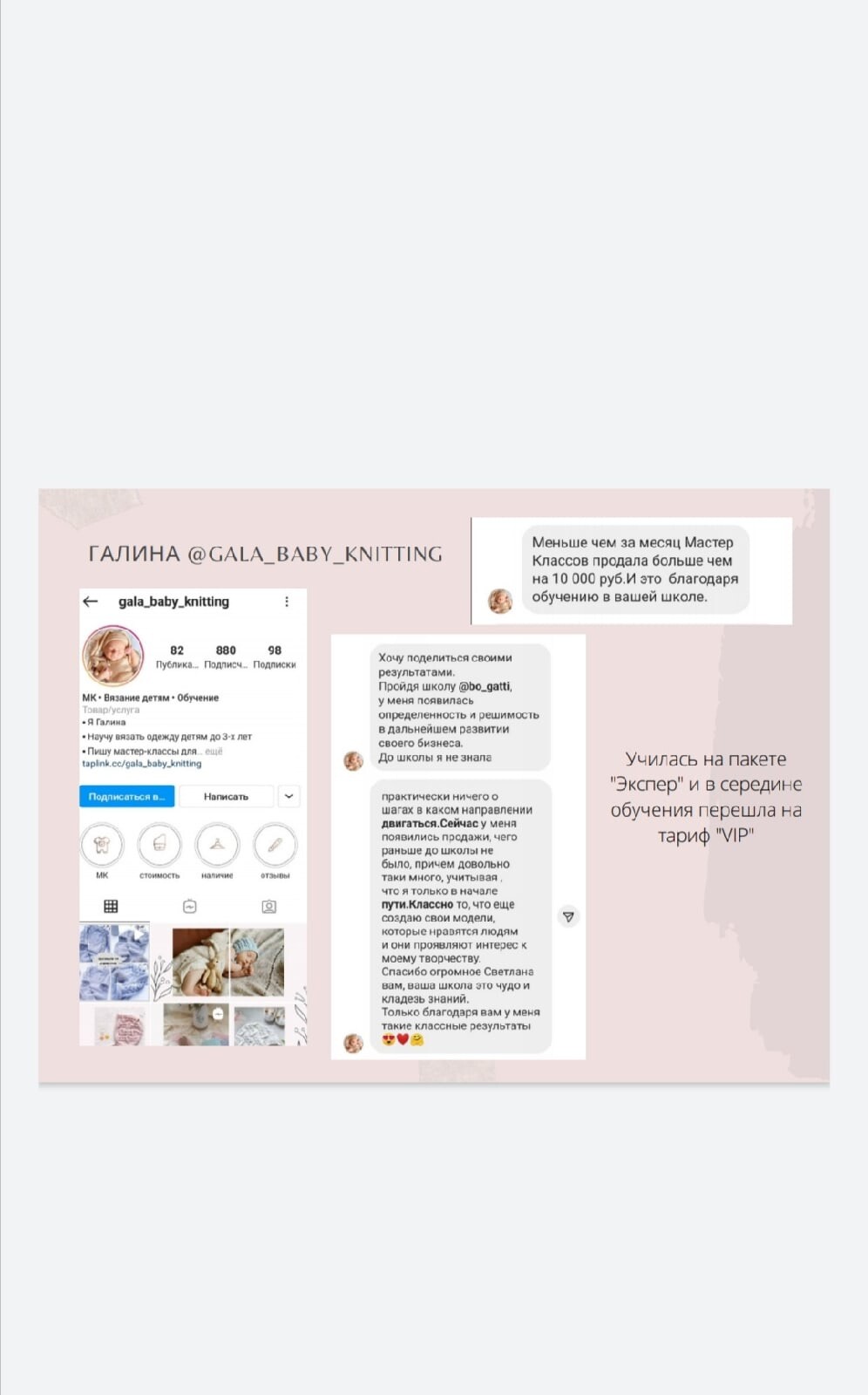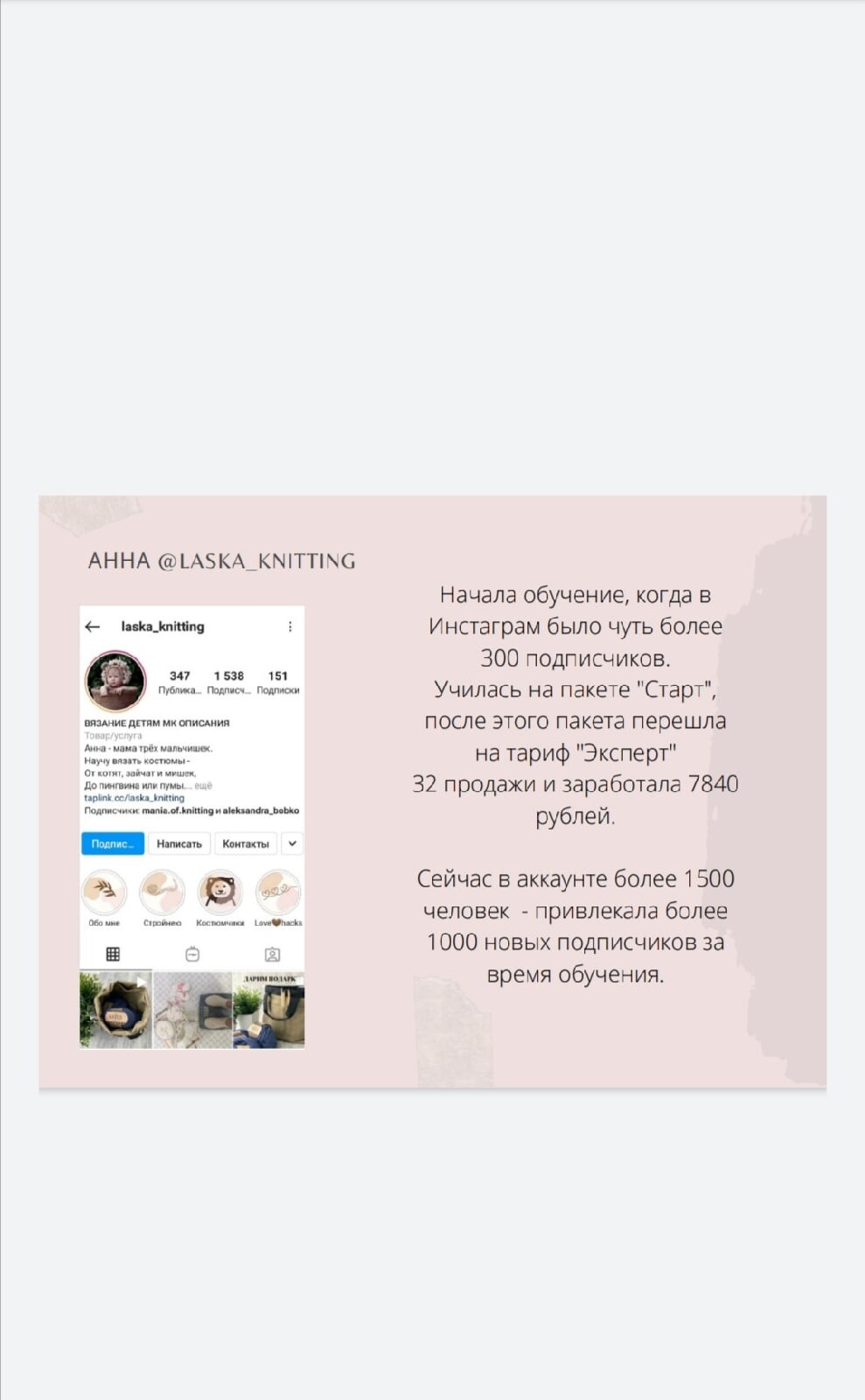 Светлана, здравствуйте .Хотела с Вами поделиться, что у меня и как на сегодняшний день. После обучения в Вашей школе, я окрыленная обучением, сразу приступила к написанию своего первого мастер- класса. Сказать, что было легко и не страшно- значит совру Вам. Очень переживала на первом тестирование у своих девочек. Было очень ответственно и в тоже время интересно в роли (мастера своего излелия) Но, благодаря целеустремлённости мои страхи отошли на задний план! Продажи первого мастера - класса на шапочку Cloud должна была сбить мой пыл т. к. продала всего 1 раз. Я села все проанализировала и сказала себе: Мариша - в тебя уже поверили! А значит нужно еще больше стремиться и двигаться только вперед. Следующий свой МК я выпустила сразу комплектом Marisol, который буквально встряхнул мою ЦА и меня заметили еще больше!. На данный момент я пишу 5- й МК, мои подписчики увеличились с 370 до 1500 тыс. Купили МК более 20 раз, за подписку подарила девочкам МК на воротничок более 100 раз. Н , я еще не перестаю вязать на заказ, и здесь я тоже смогла совместить.Если я беру вязать не большие вещи на заказ, то я сразу записываю на него МК.Во общем Светлана, обучение в вашей школе приносит свои реальные доходы, но если реально не ждать чудо , а упорно работать с вдохновением. Теперь я не представляю свою жизнь без написания МК.Моя благодарность к Вам безгранична. Я думаю Вы ее чувствуете